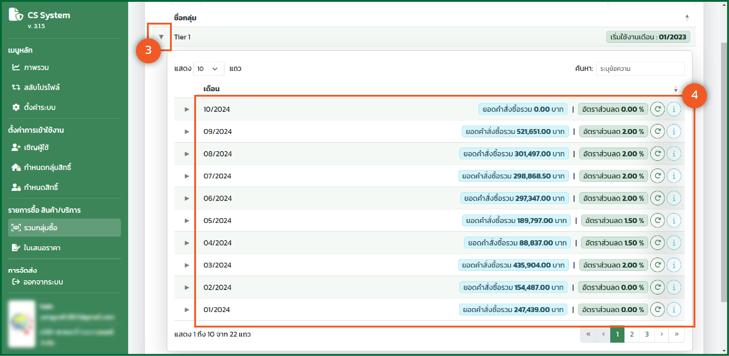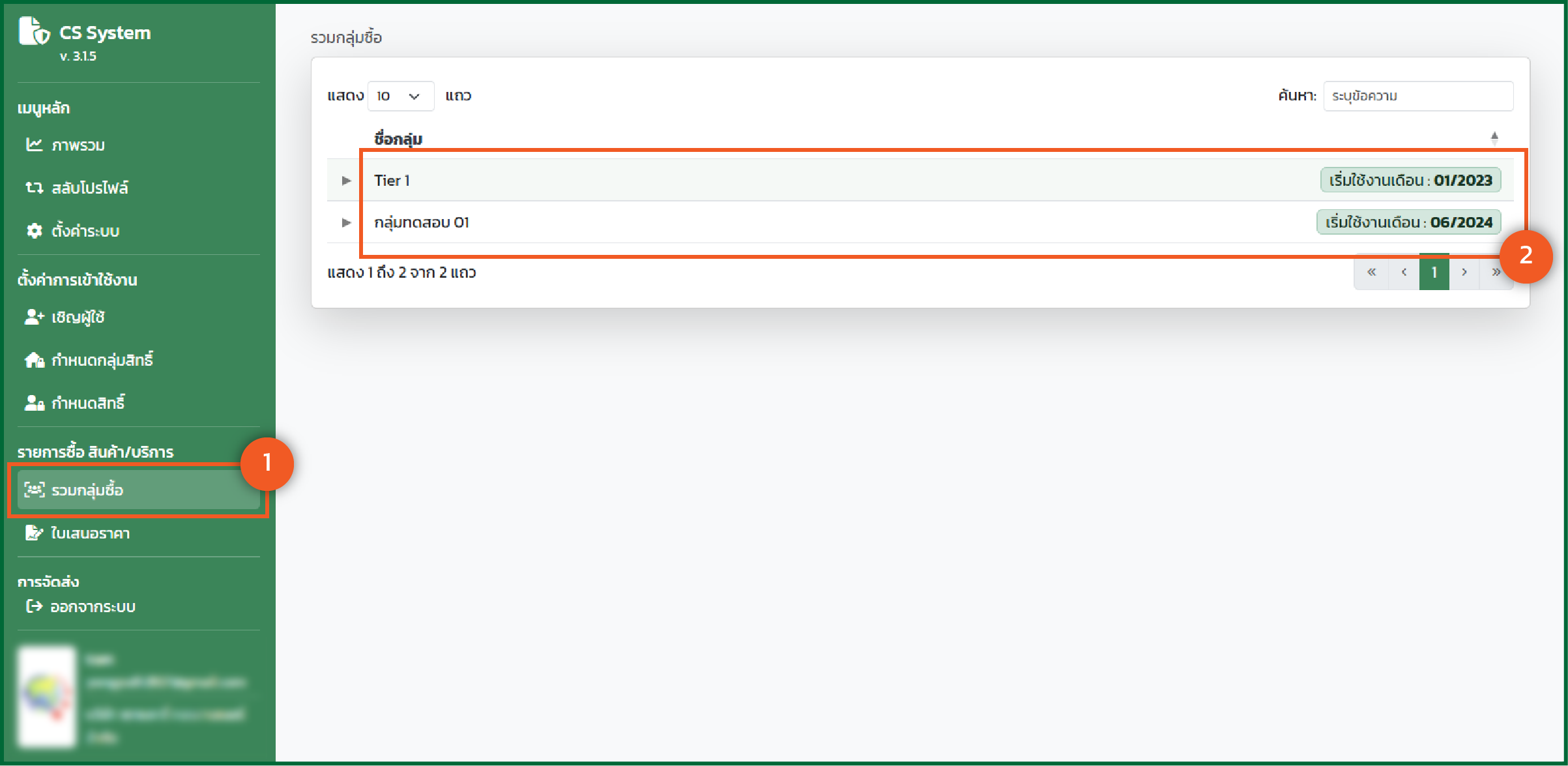 - ระบบจะเข้าสู่หน้าหลักของรวมกลุ่มซื้อ โดยข้อมูลแต่ละรายการจะแสดง "ชื่อกลุ่ม" และ "เริ่มใช้งานเดือน" ไหน
