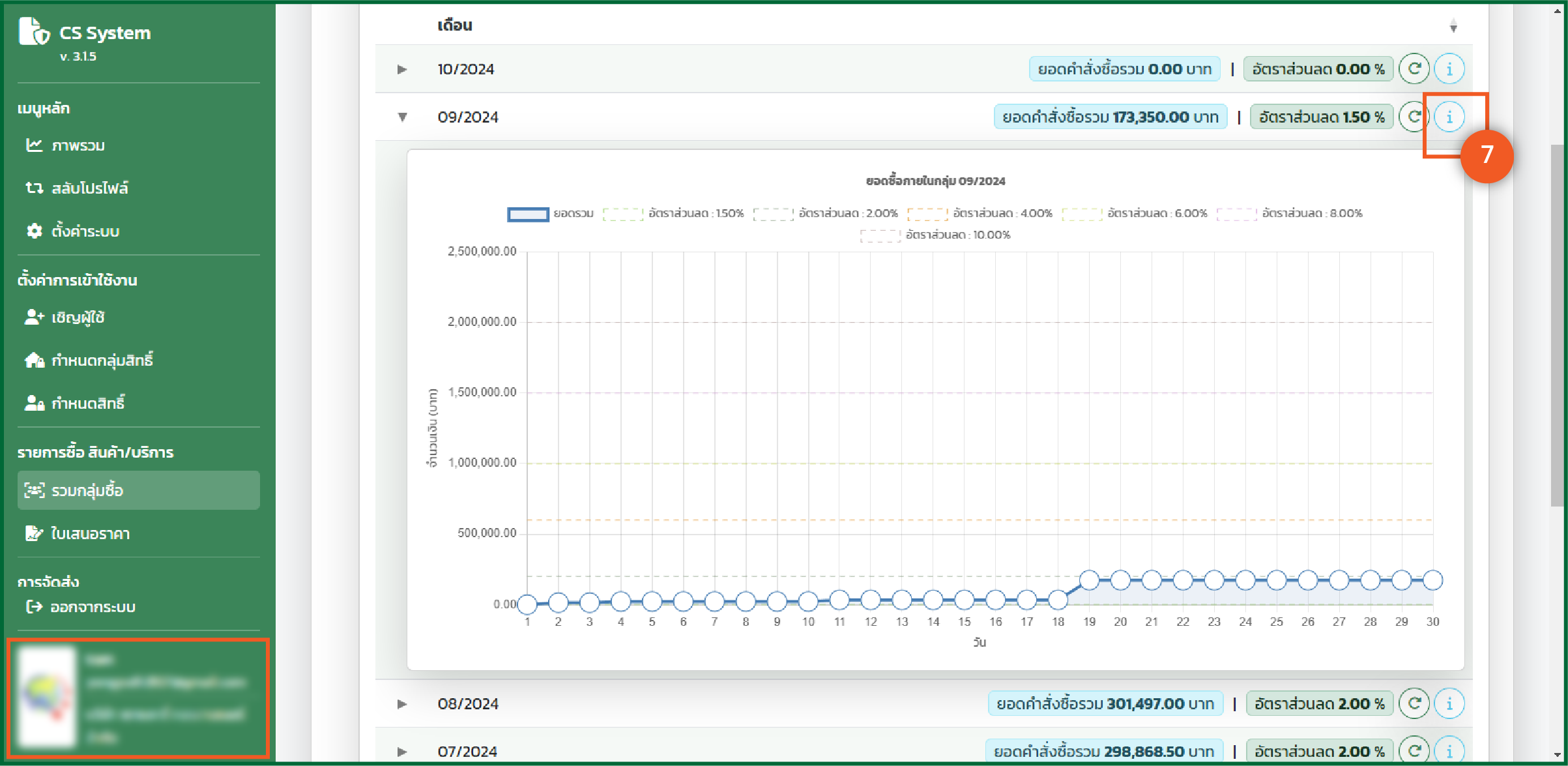 - "อัตราส่วนลด" ที่ได้ภายในเดือนนั้นๆ *** ถ้าเป็นเดือนปัจจุบันจะแสดงยอด ณ. วันที่ปัจจุบัน
