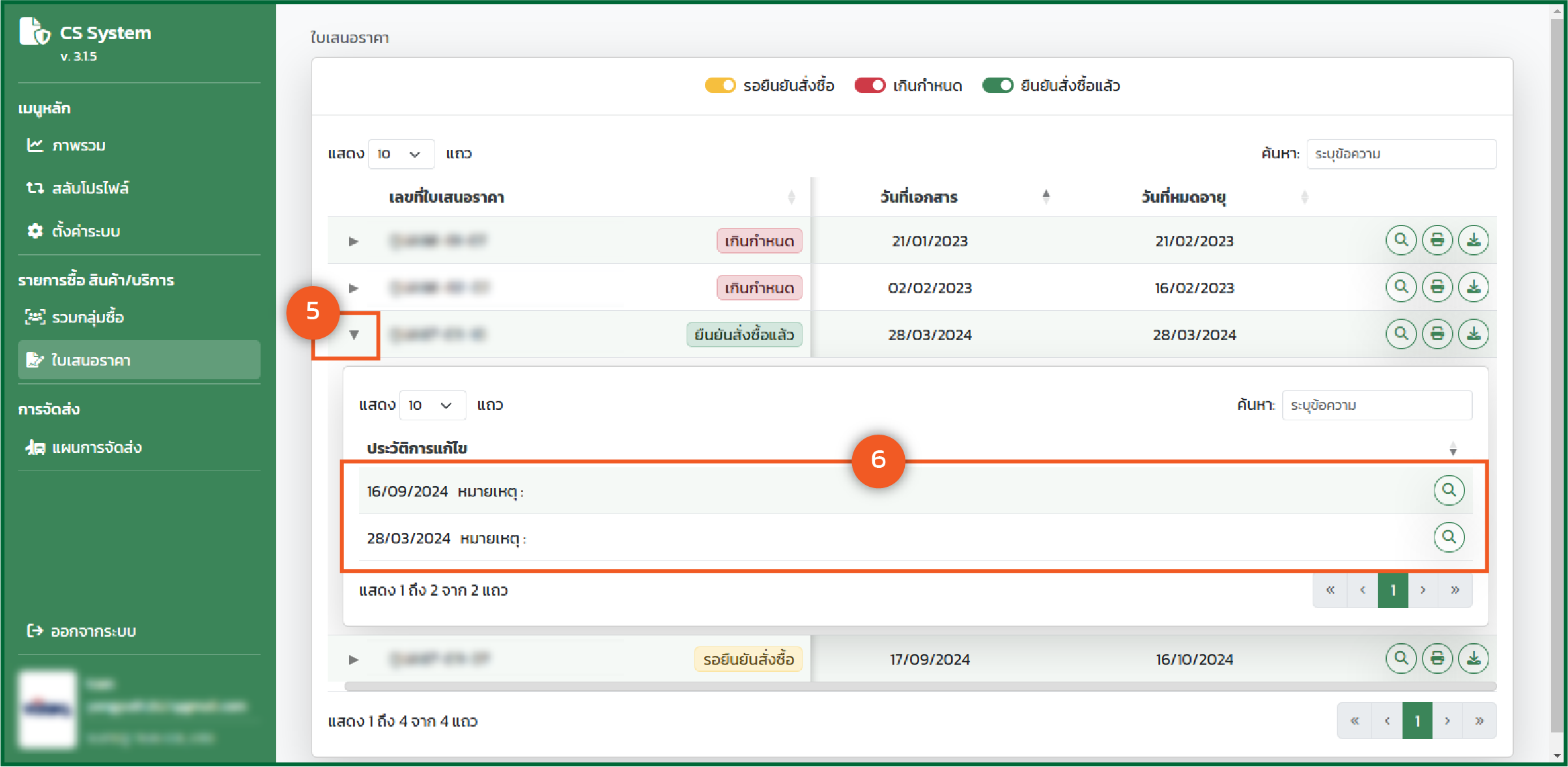 - แสดงประวัติการแก้ไขของใบเสนอราคา และสามารถ "ดุตัวอย่าง" เอกสารได้ *** การเข้าถึงข้อมูลประวัติขึ้นอยู่กับผู้ขายเป็นผู้ให้สิทธิ์